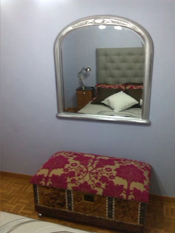 El espejo es antiguo, el cual estaba deteriorado, hubo que lijarlo y pintarlo en los colores de la habitación, en algunas partes fue desgastado para que diera la impresión del paso del tiempo. Es un espejo que se coloca encima de una cómoda (de ahí su corte recto en la parte inferior) pero me resulto interesante el combinarle con el zapatero, así aparte del aspecto decorativo, también tiene diferentes usos como pie de cama, tocador o incluso rincón de lectura.