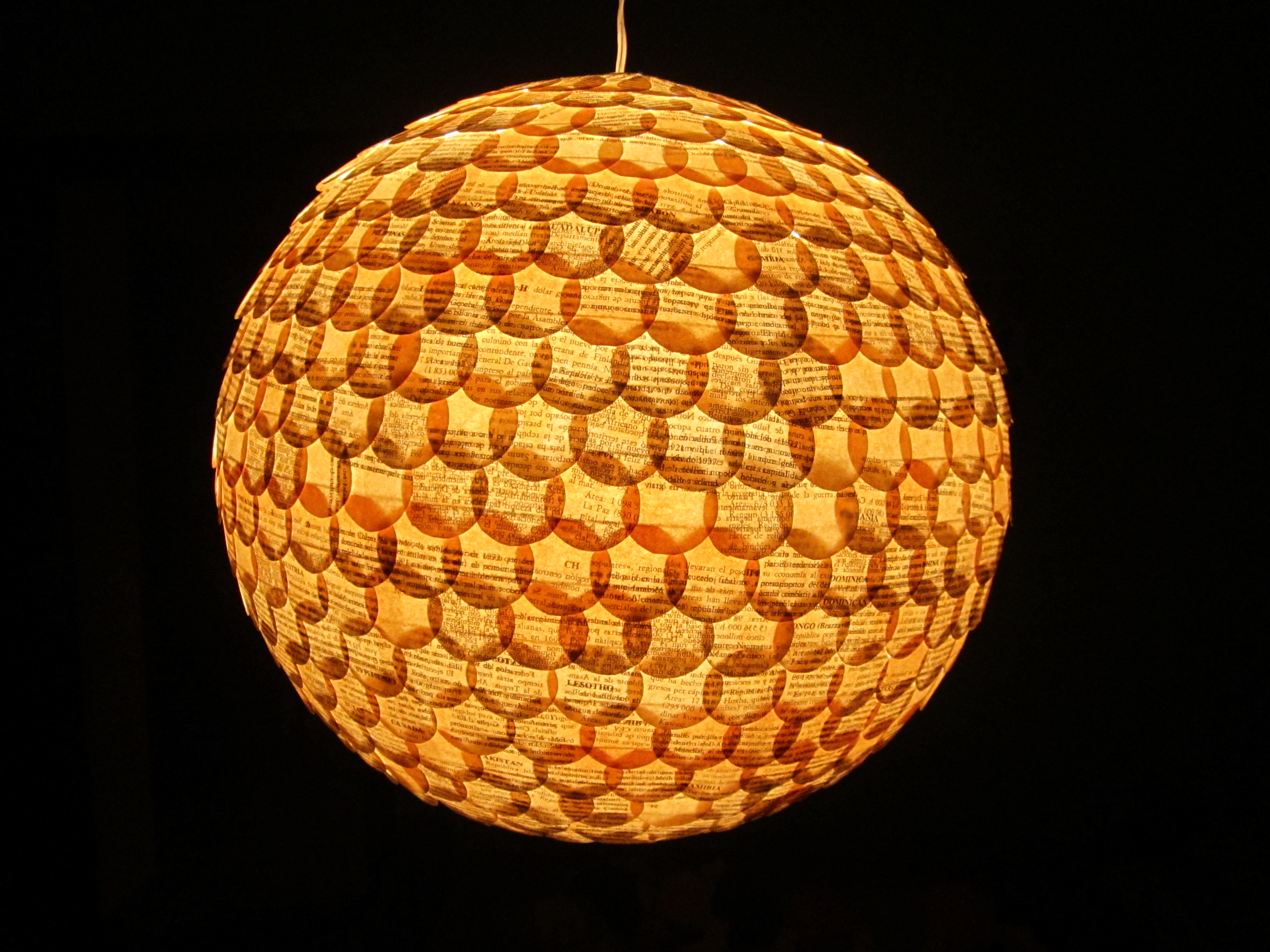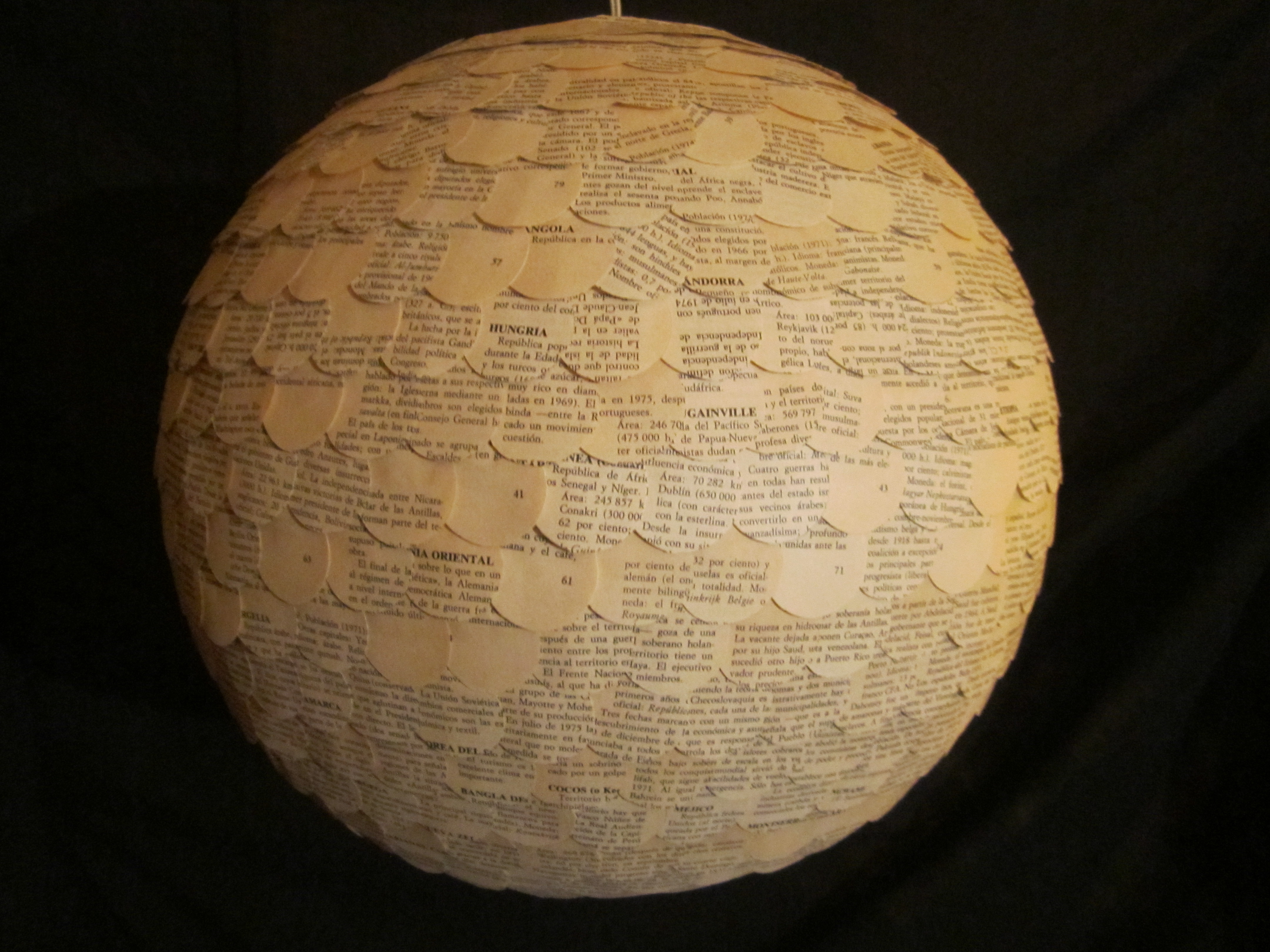 Es una lámpara china de esas que podemos encontrar en muchos establecimientos, la cual he forrado, como ya he dicho con los recortes de papel, formando escamas o tejas tapando dicha bola. El material utilizado para ello es una simple cola de barra.