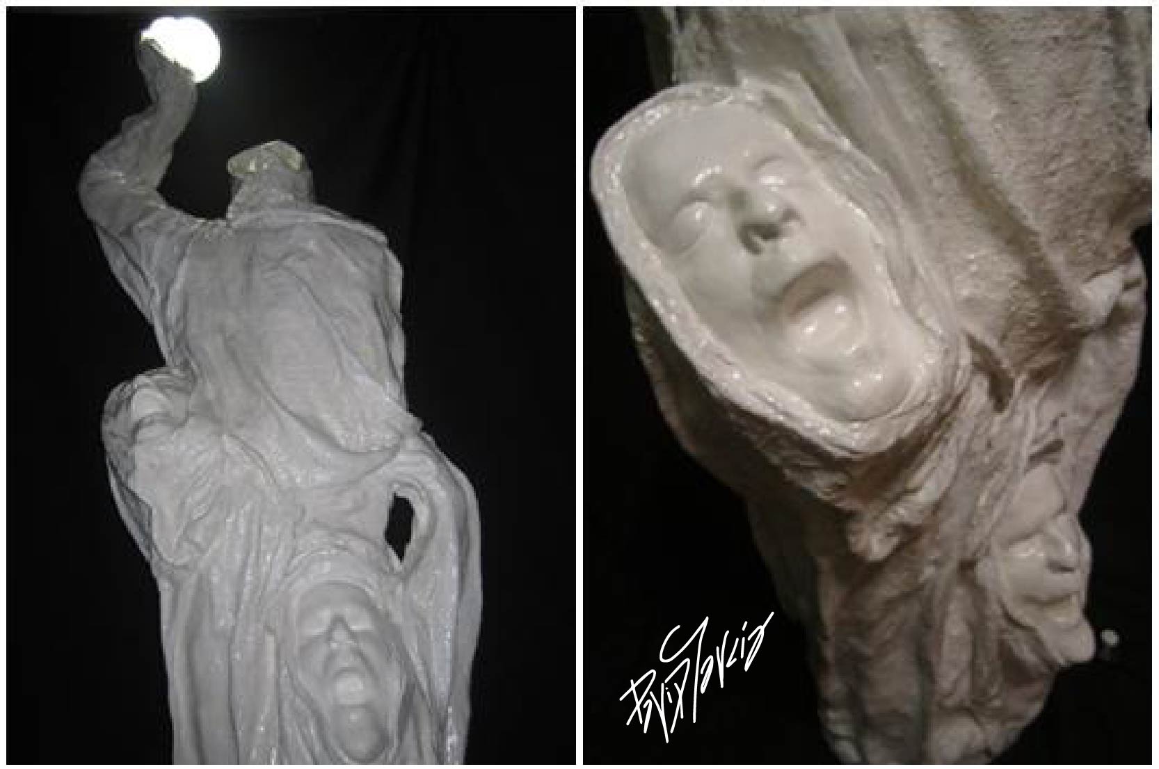 Se trata de una “lámpara escultura” realizada con escayola y otros materiales, algunos de ellos como siempre reciclados. Para que os hagáis una idea esta mide 1,70 aproximadamente. Es una escultura abstracta, compuesta por tres caras que hacen pensar en tres cuerpos fundidos en uno, dentro de un juego de luces y sombras, que desean alcanzar desesperadamente la luz.