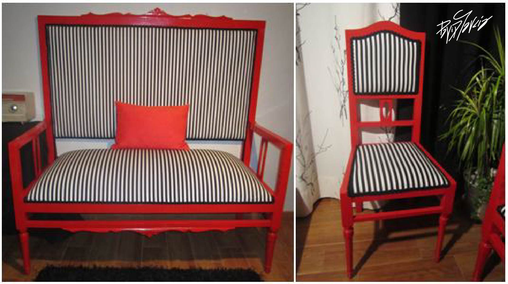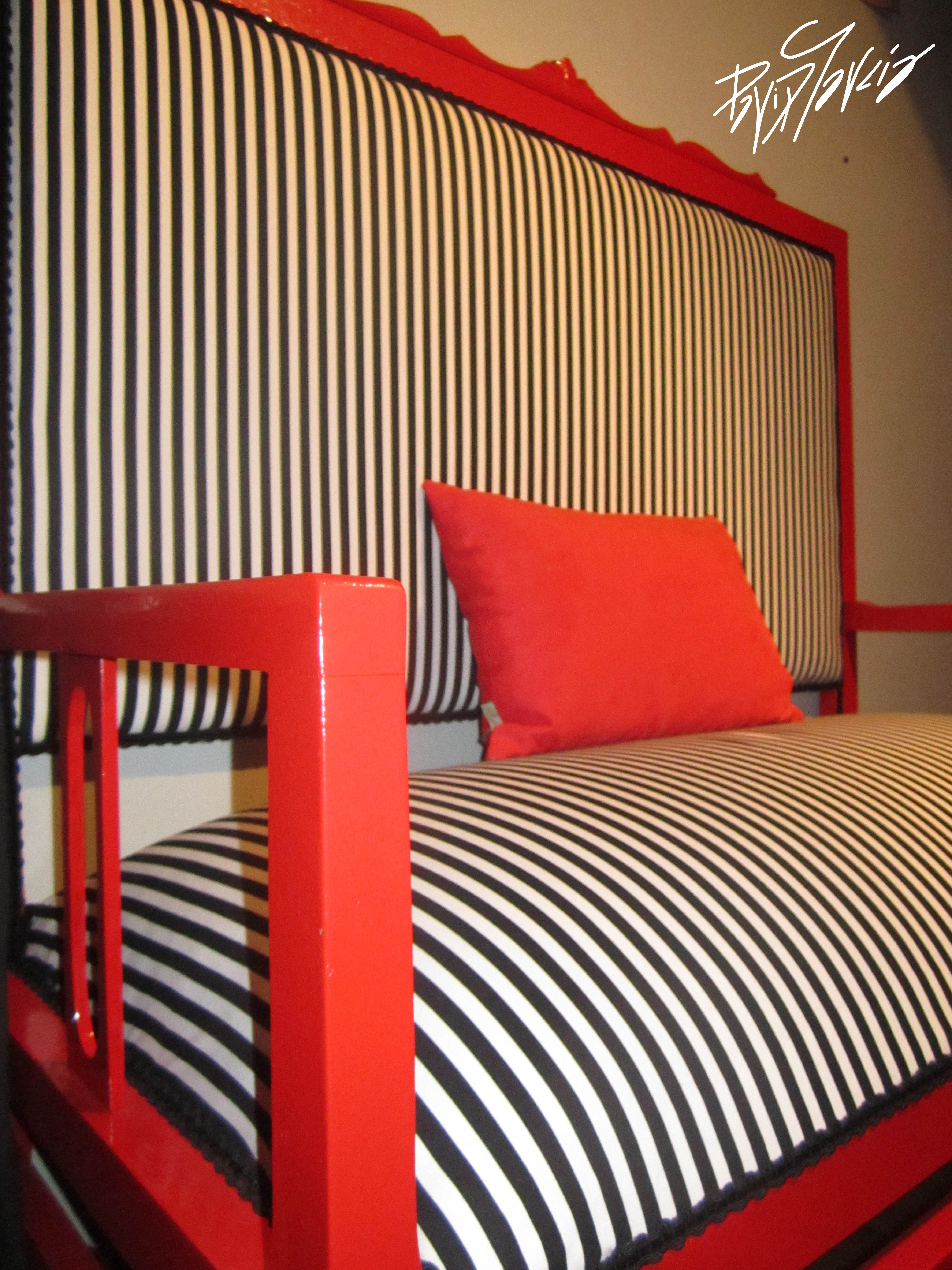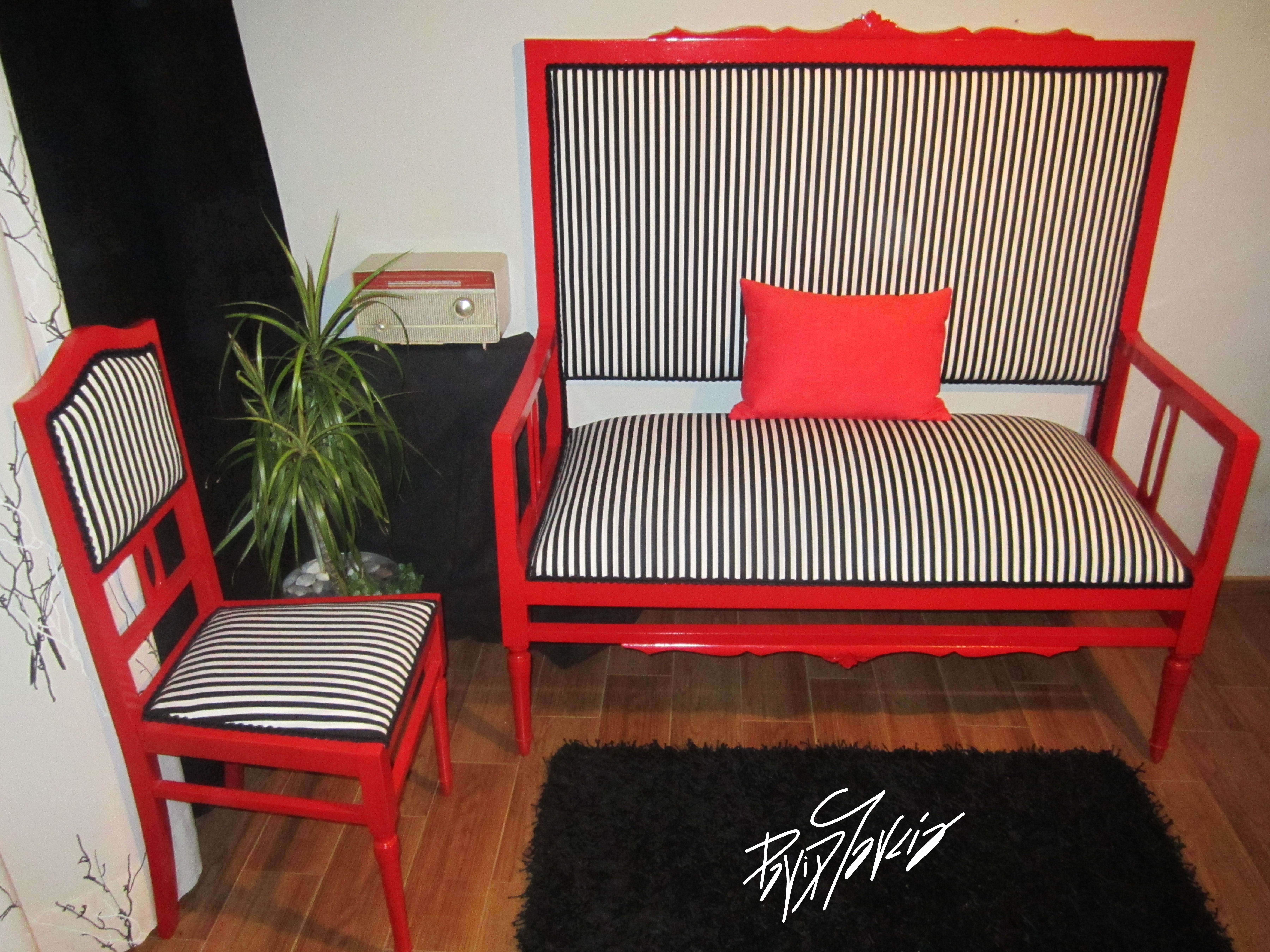 Decidí darle un estilo “barroco-pop”. Por lo tanto, la estructura sigue teniendo el estilo original, pero al pintarlo de color rojo se consigue una pieza más atrevida y vistosa. La tela que lleva el tapizado es a rayas blancas y negras con un aire “Tim Burton”.