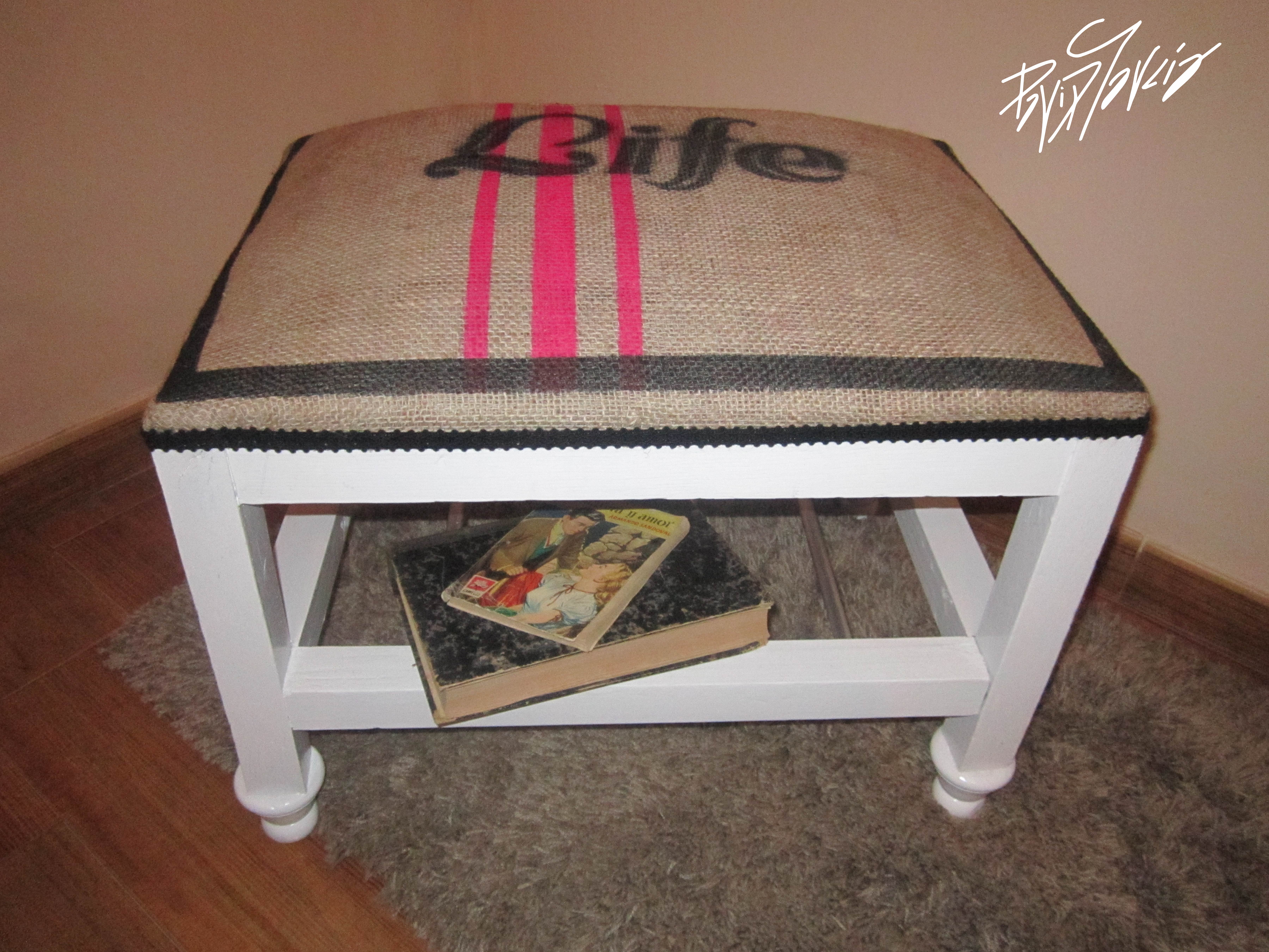 Este “taburete” tiene muchos años de antigüedad ya que esta echo con muelles y su relleno era de esparto, y esto se utilizaba hace bastante tiempo. Para este proyecto decidí sanearlo pero me pareció interesante conservar los muelles. En su acabado se pintó en blanco y se tapizo en tela de saco decorada; el toque de color de esta pieza le da el rosa de las rayas. El remate final de las patas se le añadió de unas piezas recicladas de un sofá desechado. Por último, y para darle más utilidad, coloque unas barras de aluminio en la parte inferior en la que se pueden recoger revistas, libros, etc.