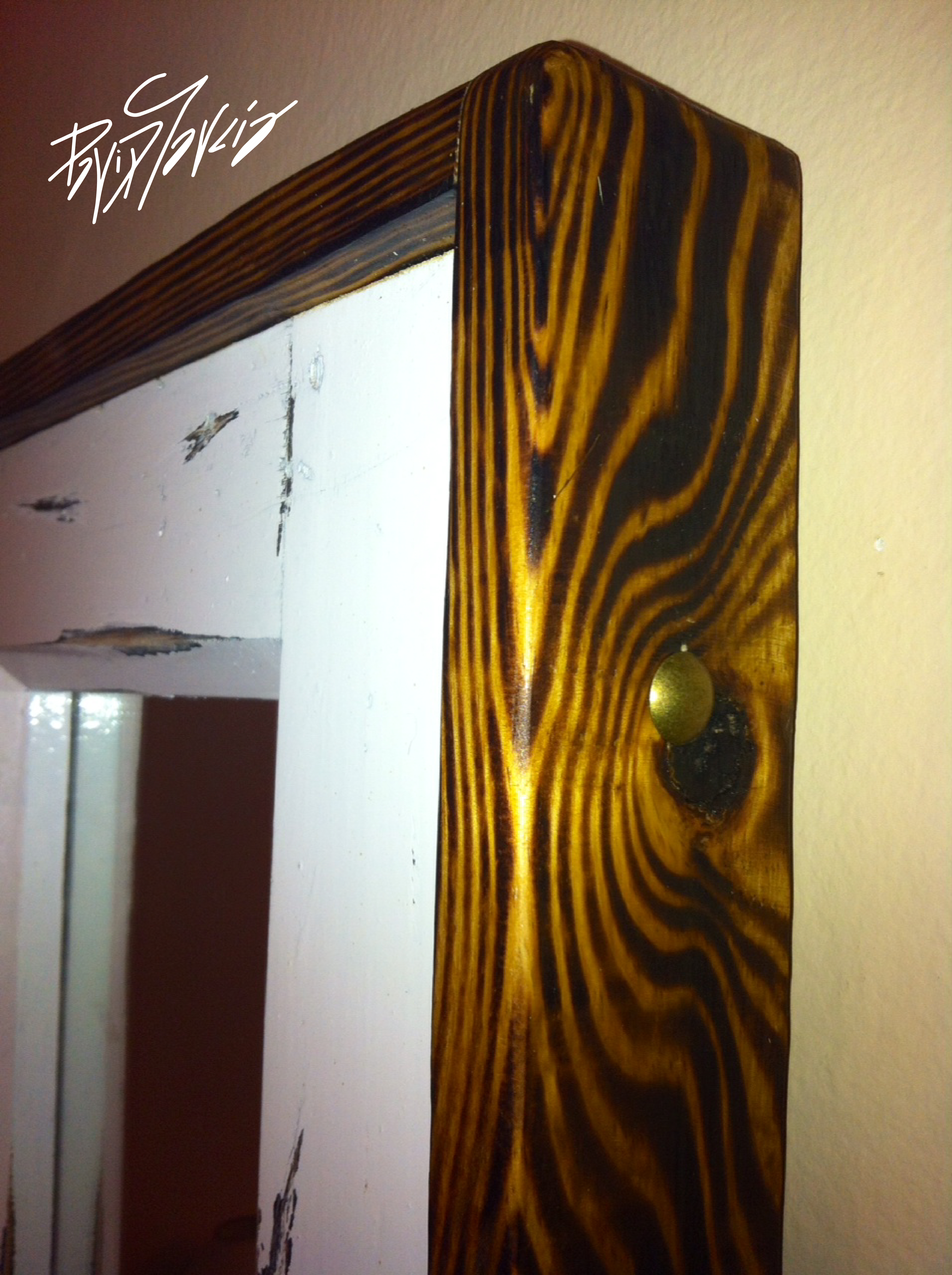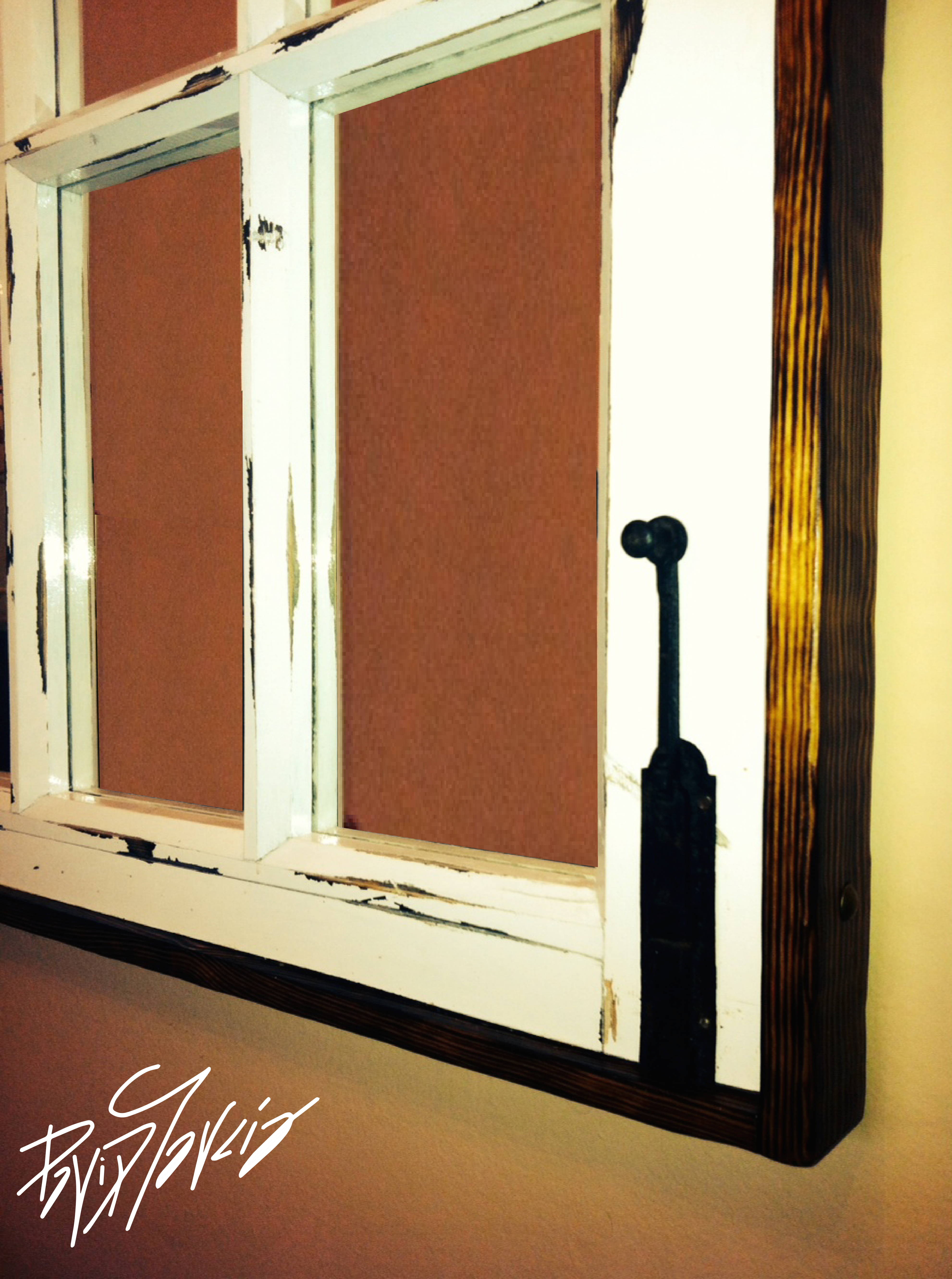 A raíz de que me encontrara esta ventana, pensé en esta idea. Ésta fue pintada en color blanco y desgastada en los lugares en los que el tiempo haría mella naturalmente. Esta enmarcada en madera de pino natural, con las betas marcadas y rematada con chinchetas. Tiene otros detalles, como un candelabro echo a partir de una pieza de una lámpara pintado en rojo, un antiguo cerrojo y una cenefa coronando el espejo.