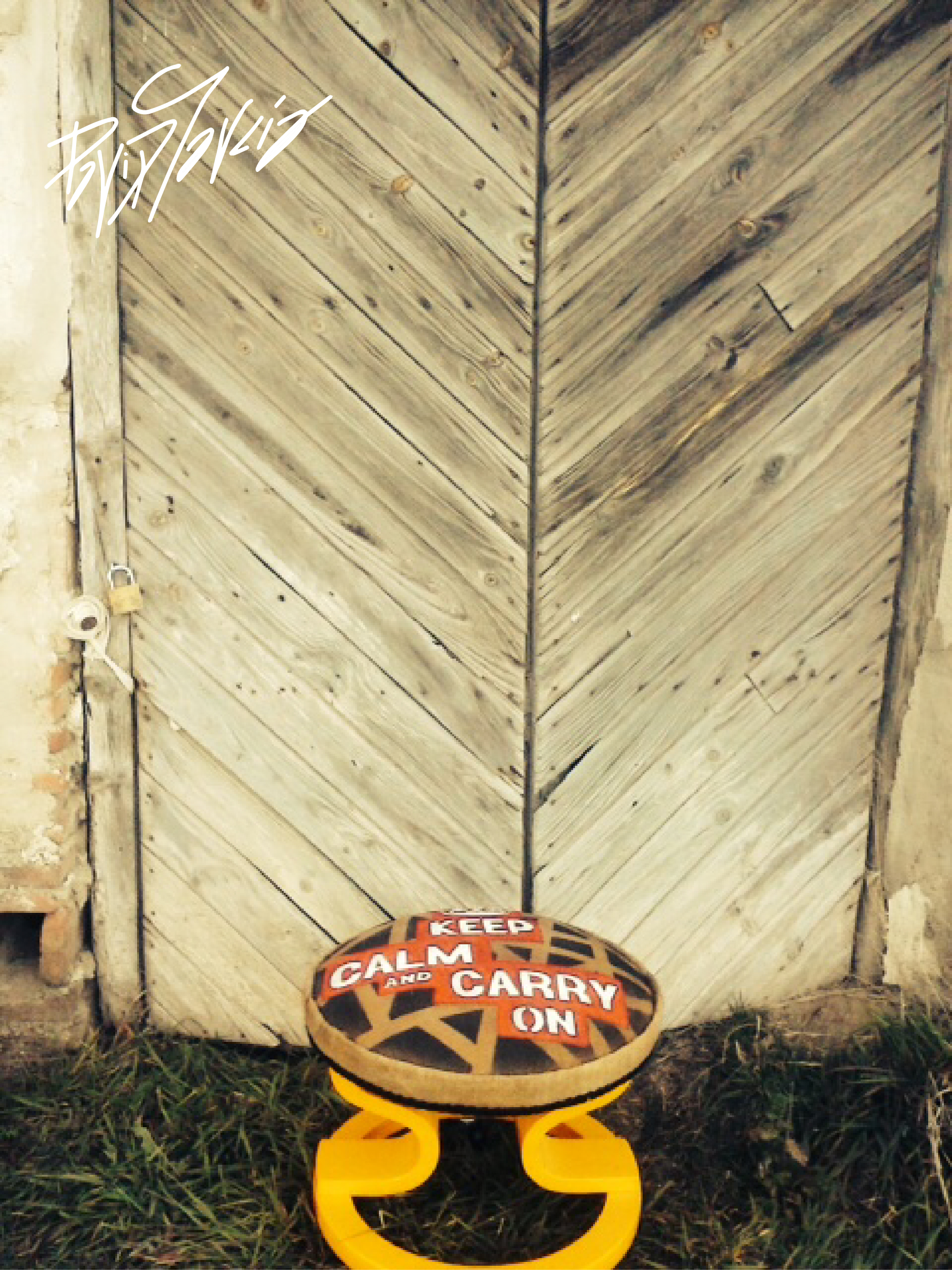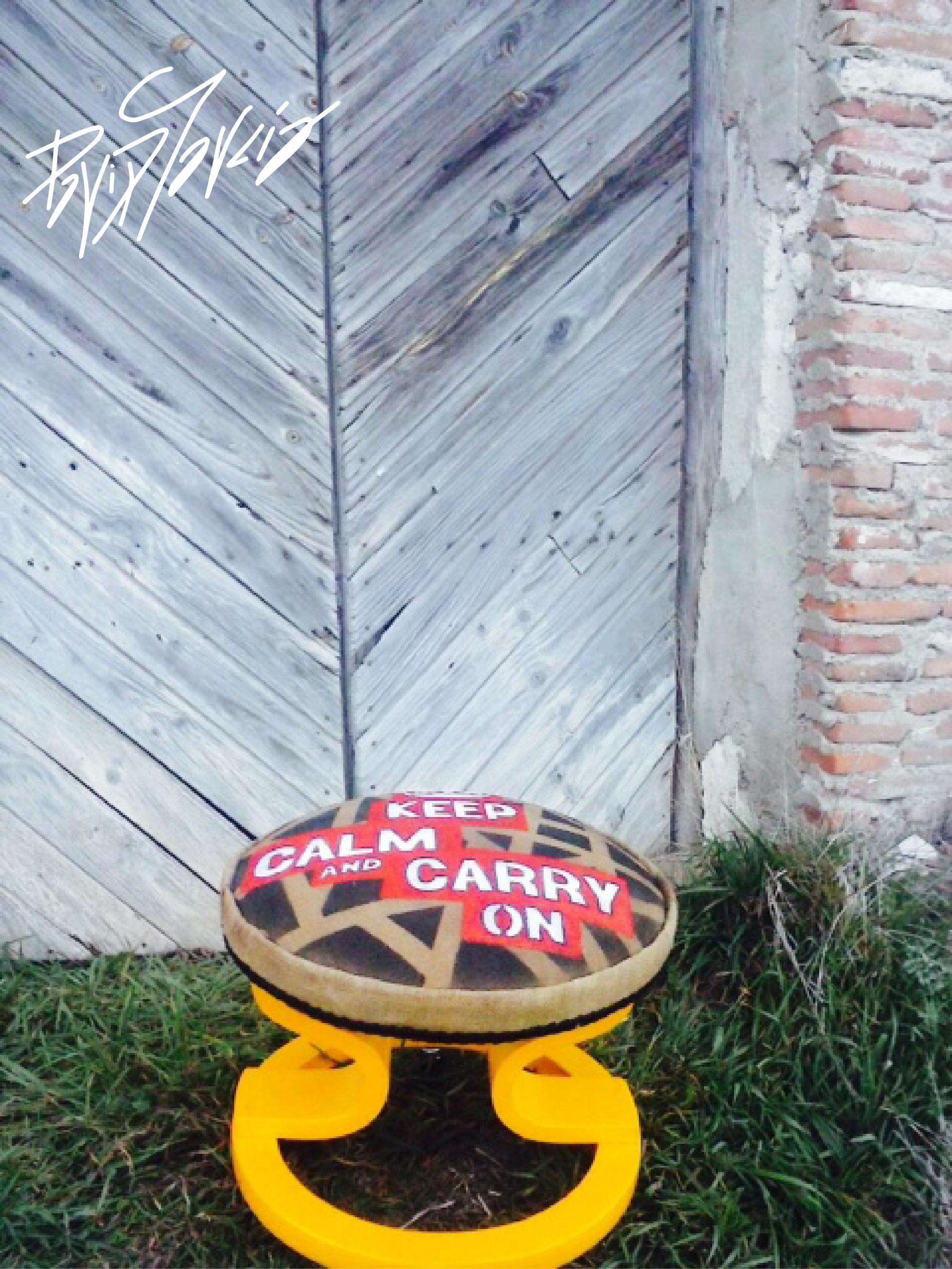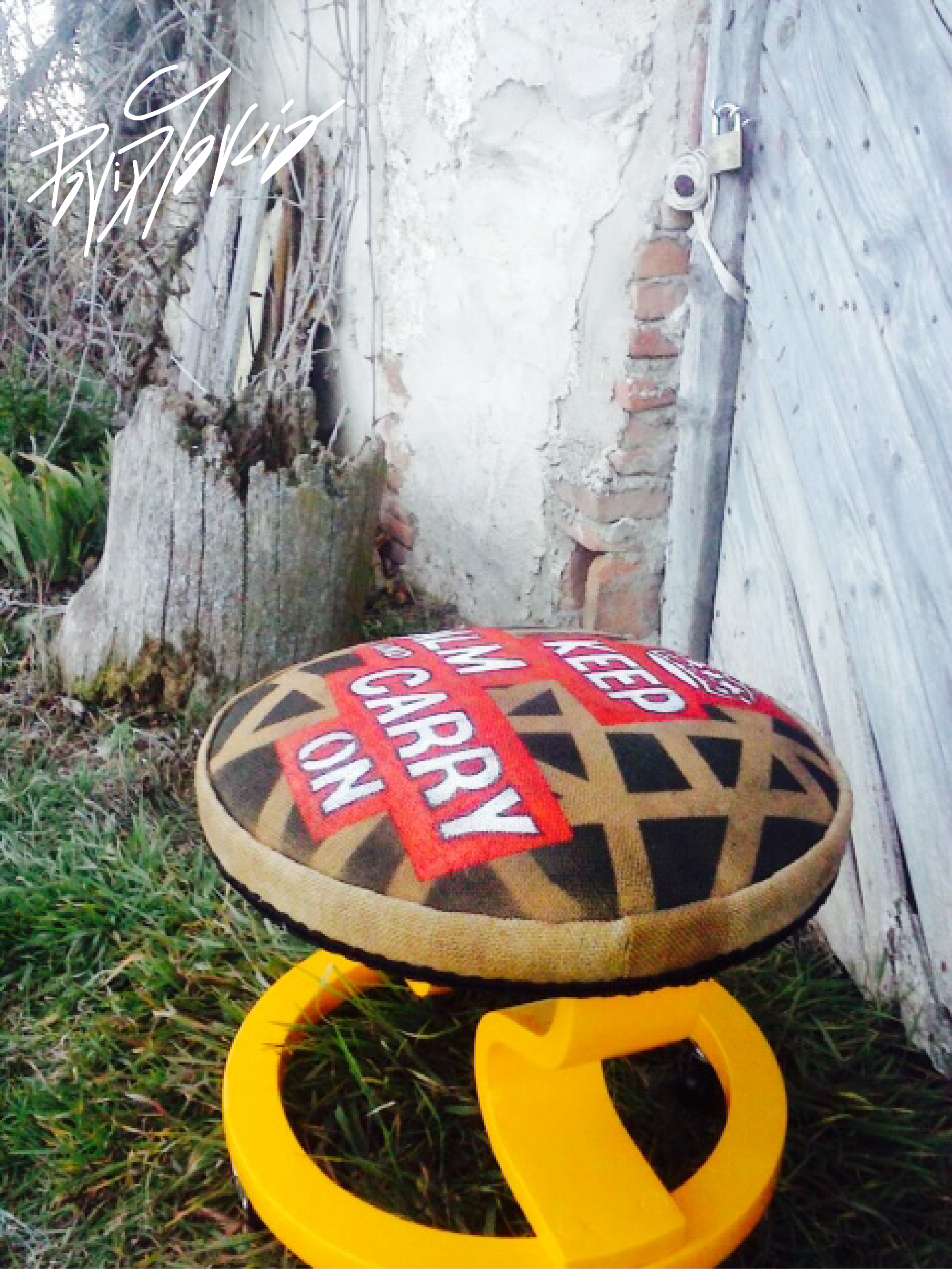El asiento es redondeado y acolchado, tapizado en tela de saco y rematado con pasamanería negra. Por ultimo, es decorado con un fondo geométrico y con el lema típico Británico pintado a mano, “keep calm and carry on” (Mantén la calma y sigue adelante).