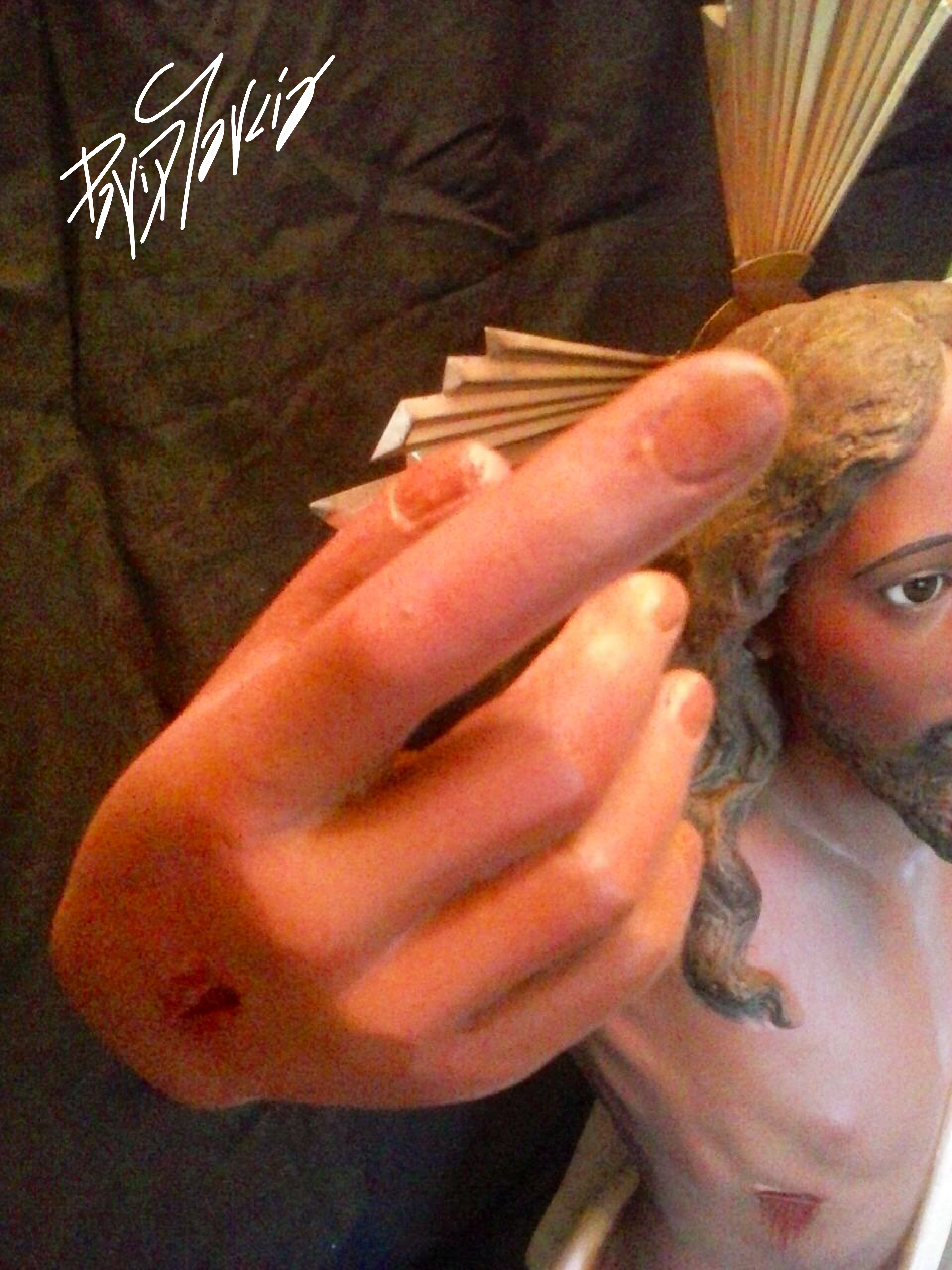 Esta pieza estaba muy estropeada debido a su uso y al paso del tiempo; tenia un brazo despegado del hombro, roto a la altura del codo y en ambas manos, varios dedos rotos.